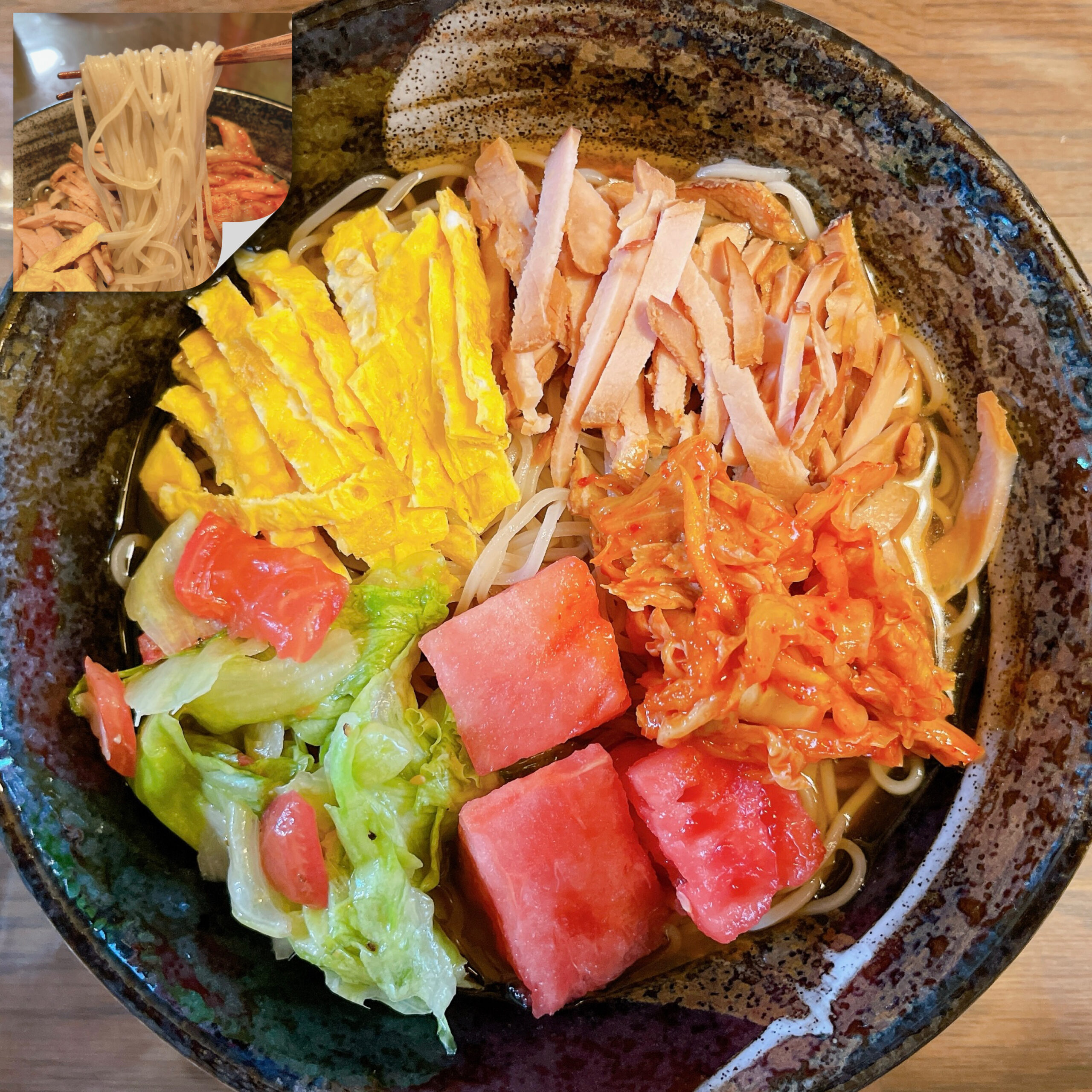 昼食は自宅で流水解凍の冷麺(信越明星)を食べた。色とりどりのトッピングは妻が用意して盛り付けたもの。