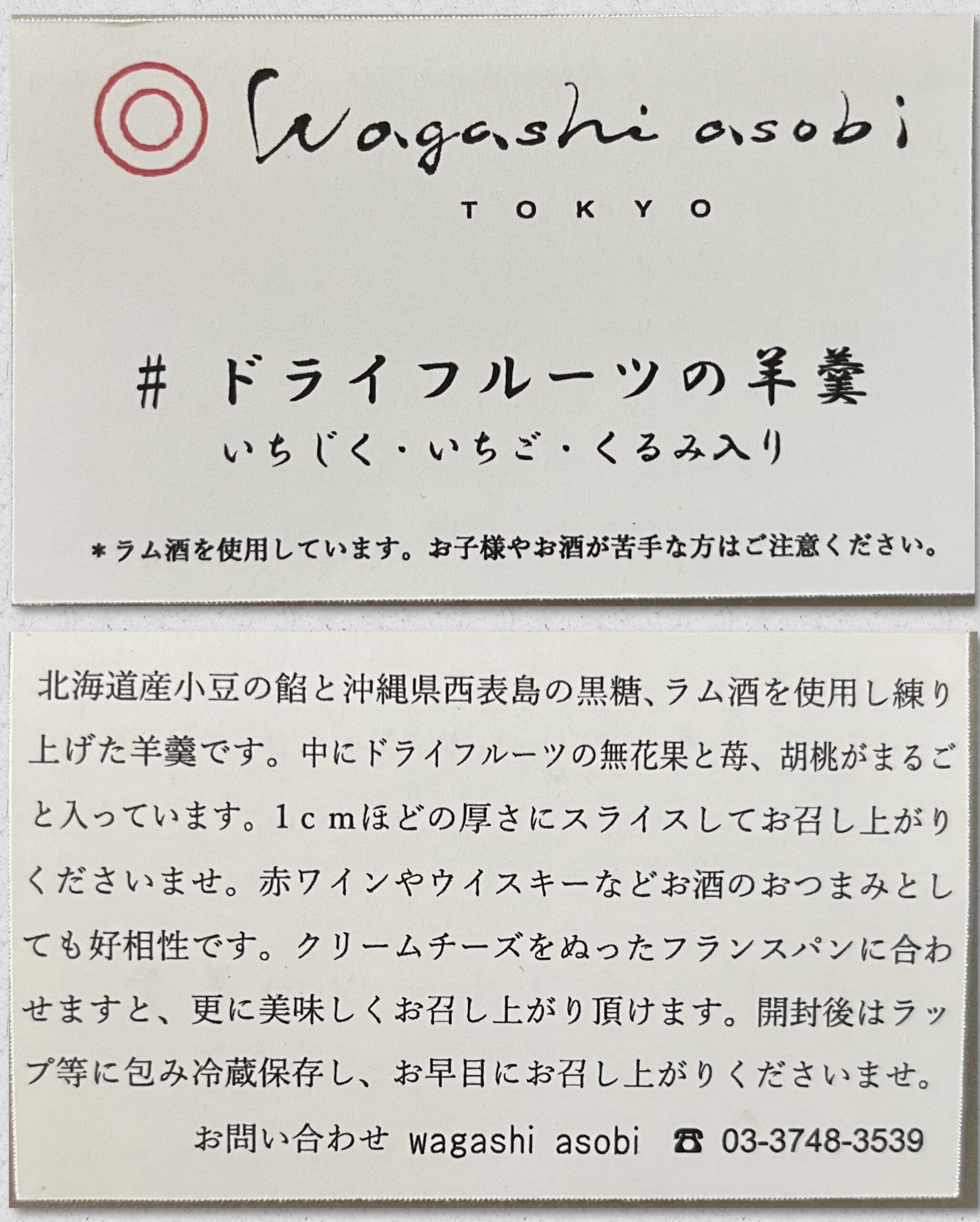 写真は先日の飲み会で友人からいただいた「Wagashi asobi」の『ドライフルーツの羊羹』。