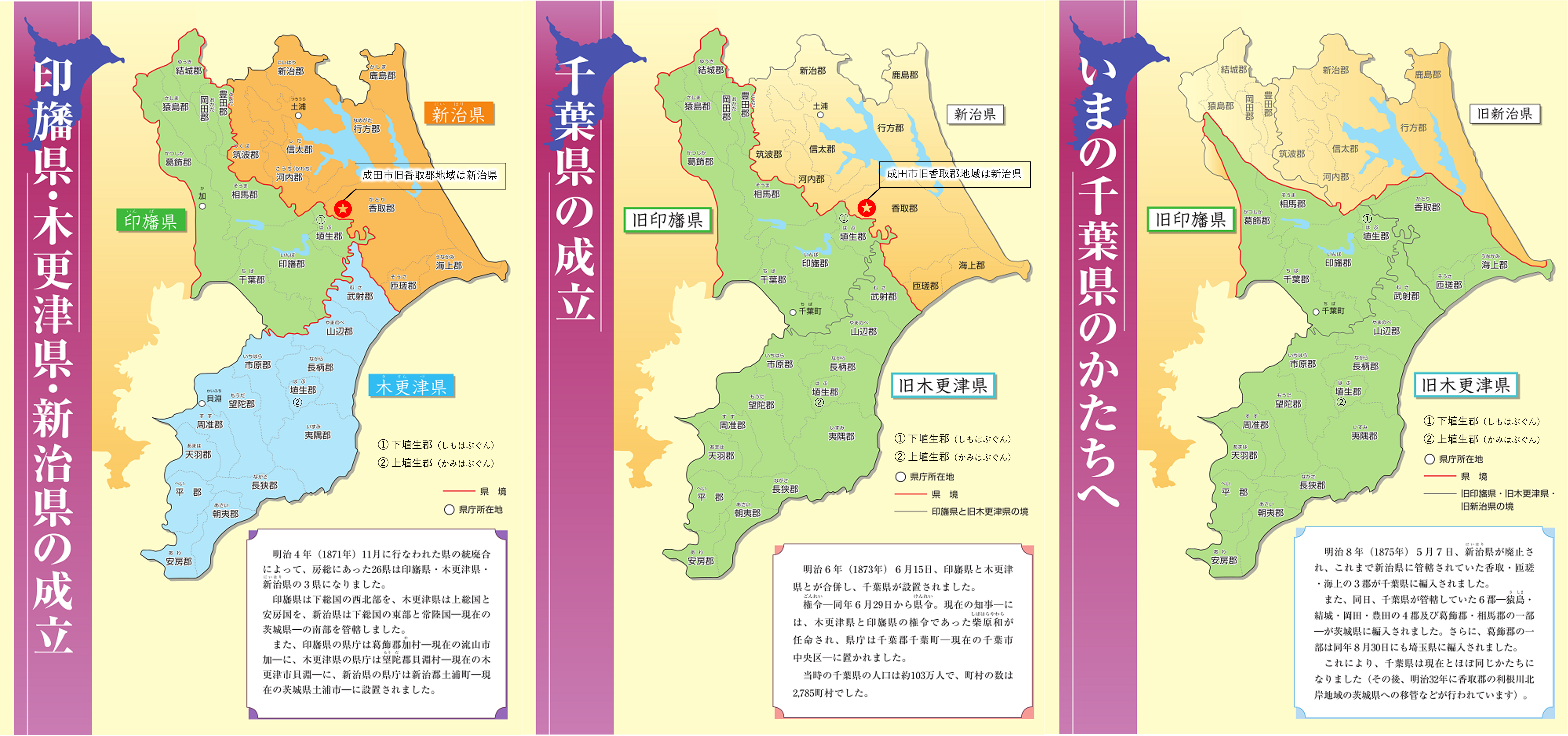 明治4年11月14日[太陽暦1871年12月25]、統廃合により印旛県(下総国西北部)、木更津県(上総国・安房国)、新治県(成田市の旧香取郡地域を含む下総国東部と常陸国南部)3県になる。