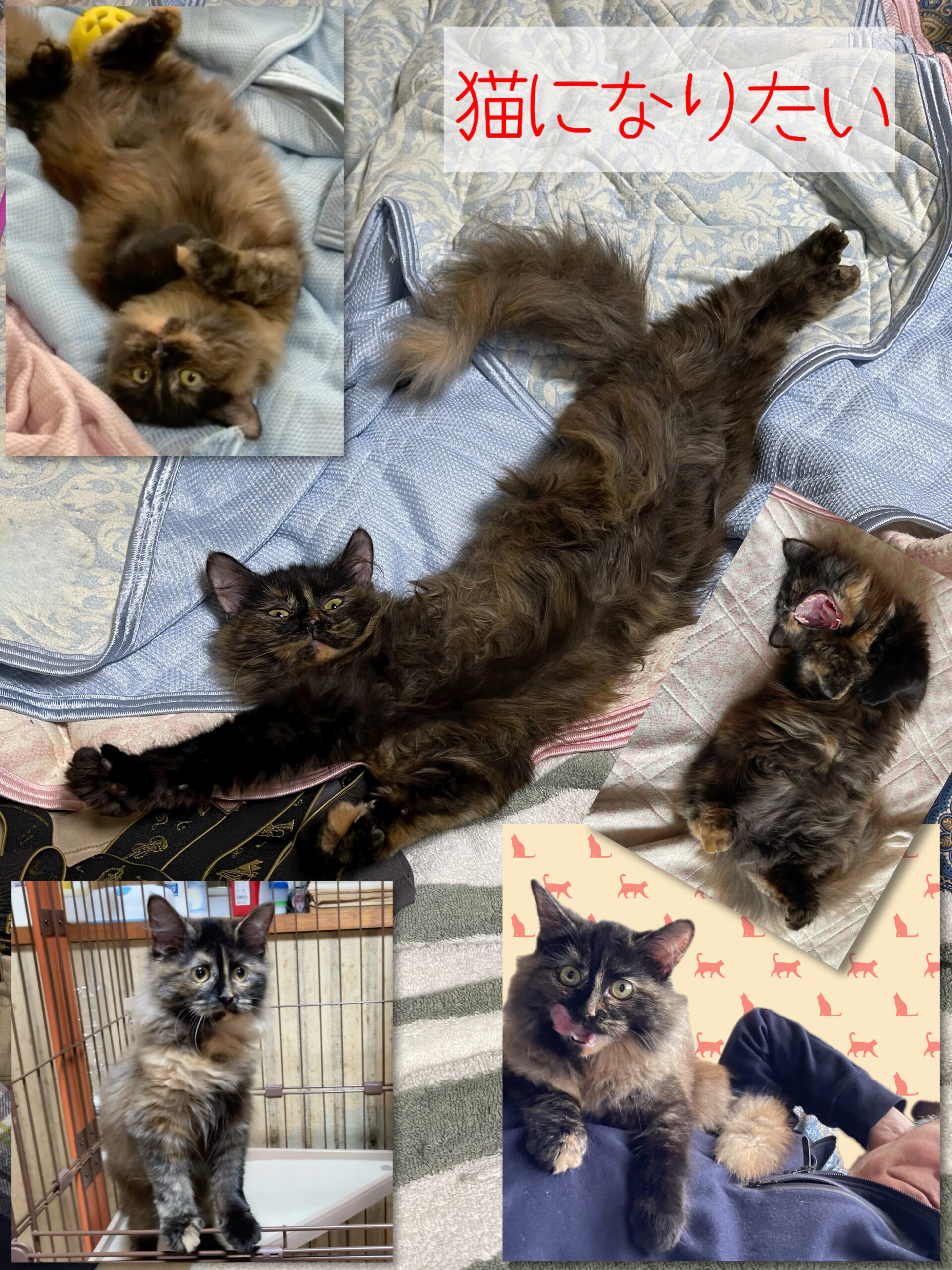 性別は雌。被毛はトーティーシェル。和名では「錆び猫・べっ甲猫」。口汚く「雑巾猫」と言われることもあるが、錆び猫は幸運を運んでくれる言い伝えがあるようだ。宝くじ当たりますよーに。