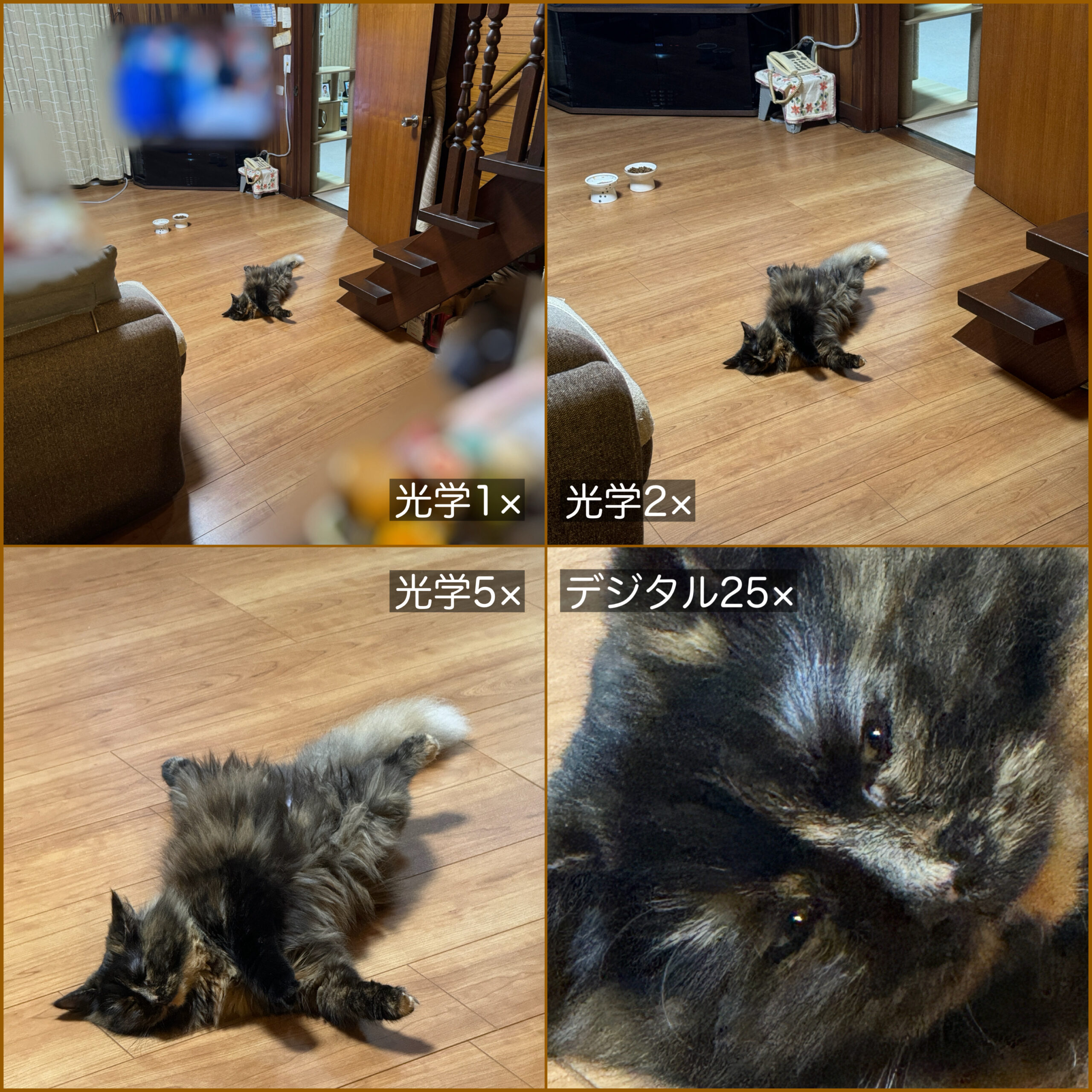 しかし、カメラズーム機能がなく、かつ画質の劣化を抑えるとしたら、わたしがスマホを持って斑に近づいて撮らなければならないし、斑もわたしの気配を感じて同じポーズでいないことだろうし、デジタルズーム25倍と同じように撮るには、斑の顔の前にスマホを近づけることになるので、斑は逃げ出すかスマホに猫パンチすることでしょう。
