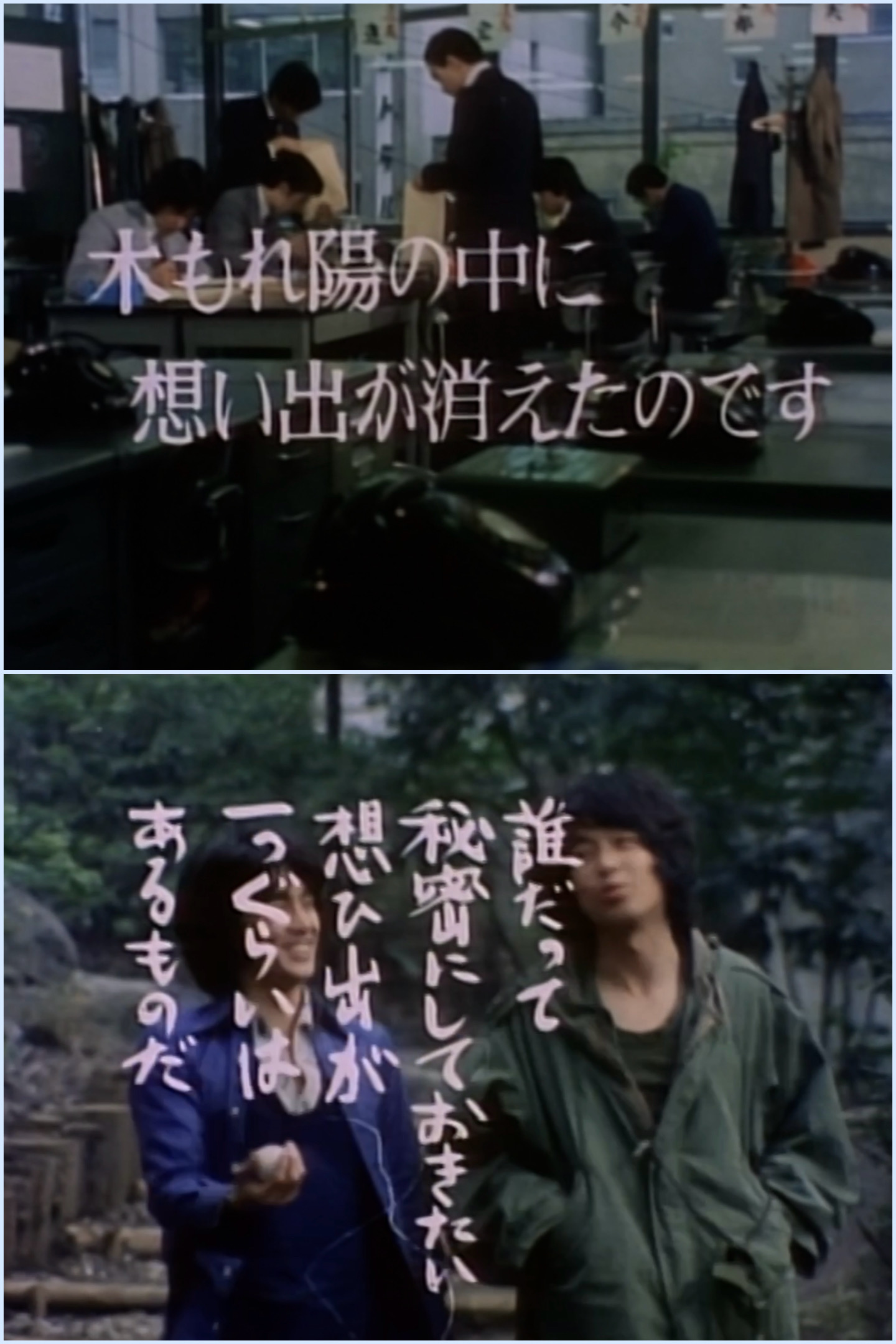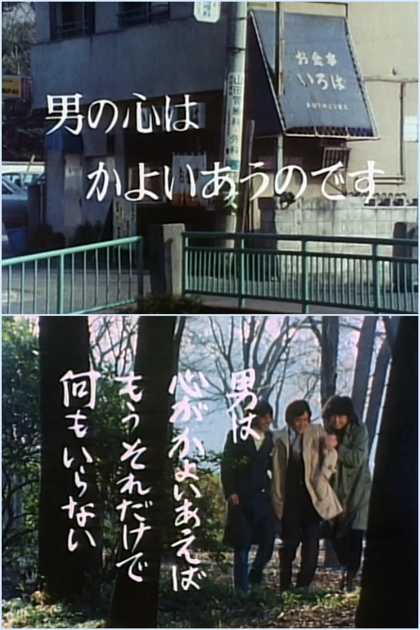 また、当時の流行曲がそれとなくBGMで流れたり、屋外ロケも多く、井の頭公園をはじめ、実在する大学キャンパス、井の頭公園駅、商店街、歓楽街、ビル中、郊外、漁港、温泉地、観光地などあり、新宿や渋谷の街並みも映し出されていた。道路を走る車も懐かしい。