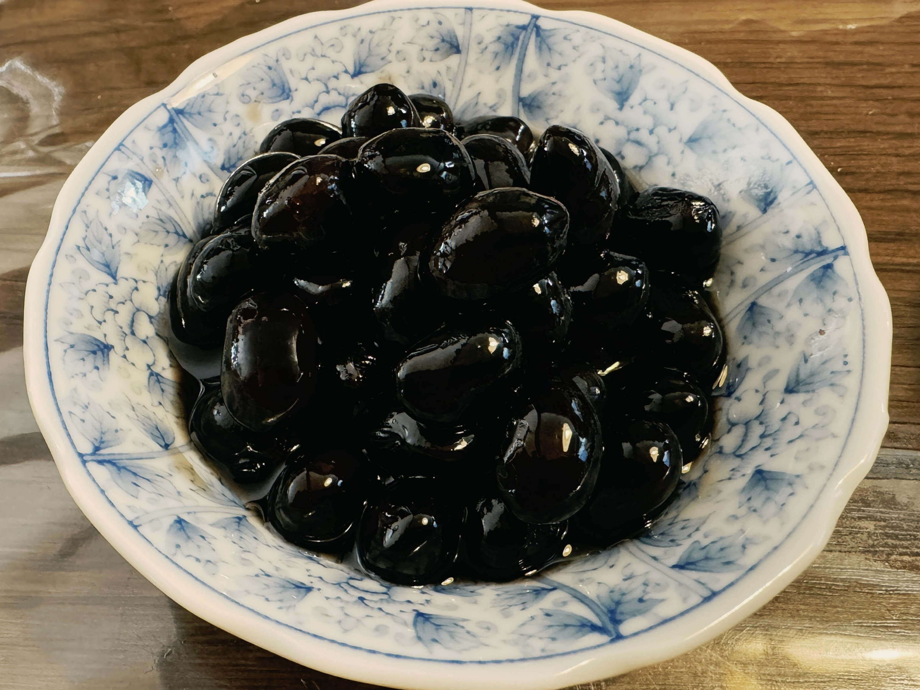 写真は毎年妻が作っている丹波篠山産の黒豆煮。鍋でさっと煮ては冷ますを3日間繰り返して作っている。調味料は三温糖、重曹、塩、醤油。そして黒光の艶を出すのに鉄玉子を入れている。